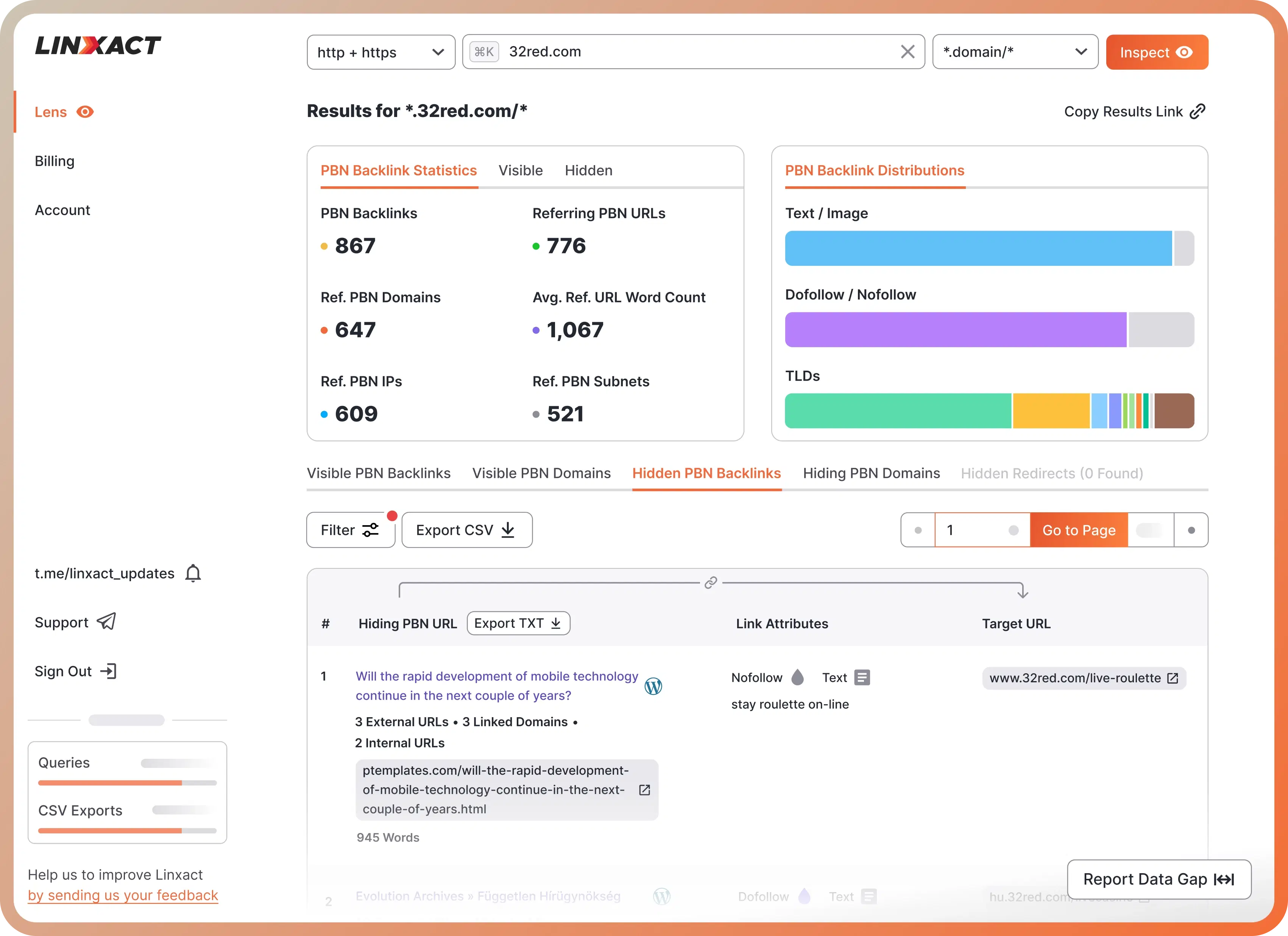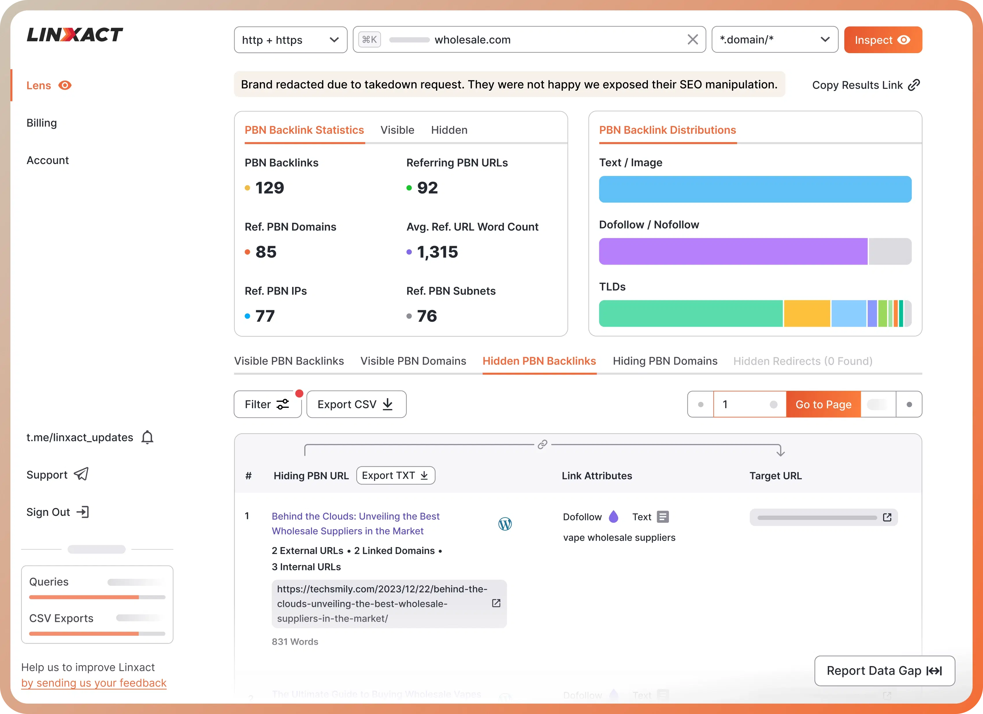 By staying stealth, hidden PBNs secure rankings without competitors replicating or reporting them as long as they don't use Linxact Lens.